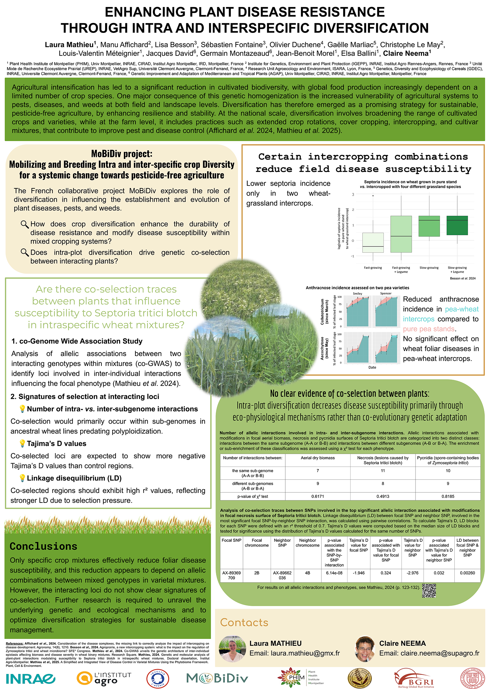Research poster titled “Enhancing Plant Disease Resistance Through Intra and Interspecific Diversification,” by Laura Mathieu and colleagues (INRAE and partners). The poster explains how crop diversification and intercropping can reduce plant disease susceptibility. It includes sections on the MoBiDiv project, research questions, genome-wide association studies, and evidence for reduced disease incidence in specific wheat–grassland and pea–wheat intercrops. Charts compare disease levels in pure stands versus intercrops, while tables summarize genetic interaction analyses showing no clear co-selection signals. The design features green and beige panels, photos of mixed cropping systems, and logos from INRAE, MoBiDiv, PHIM, and BGRI, with conclusions and contact information at the bottom.